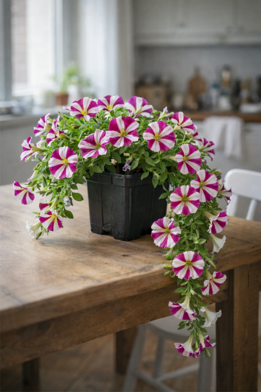 Каскадна петунія на підвіконні: охайний ріст і перші хвилі цвітіння.