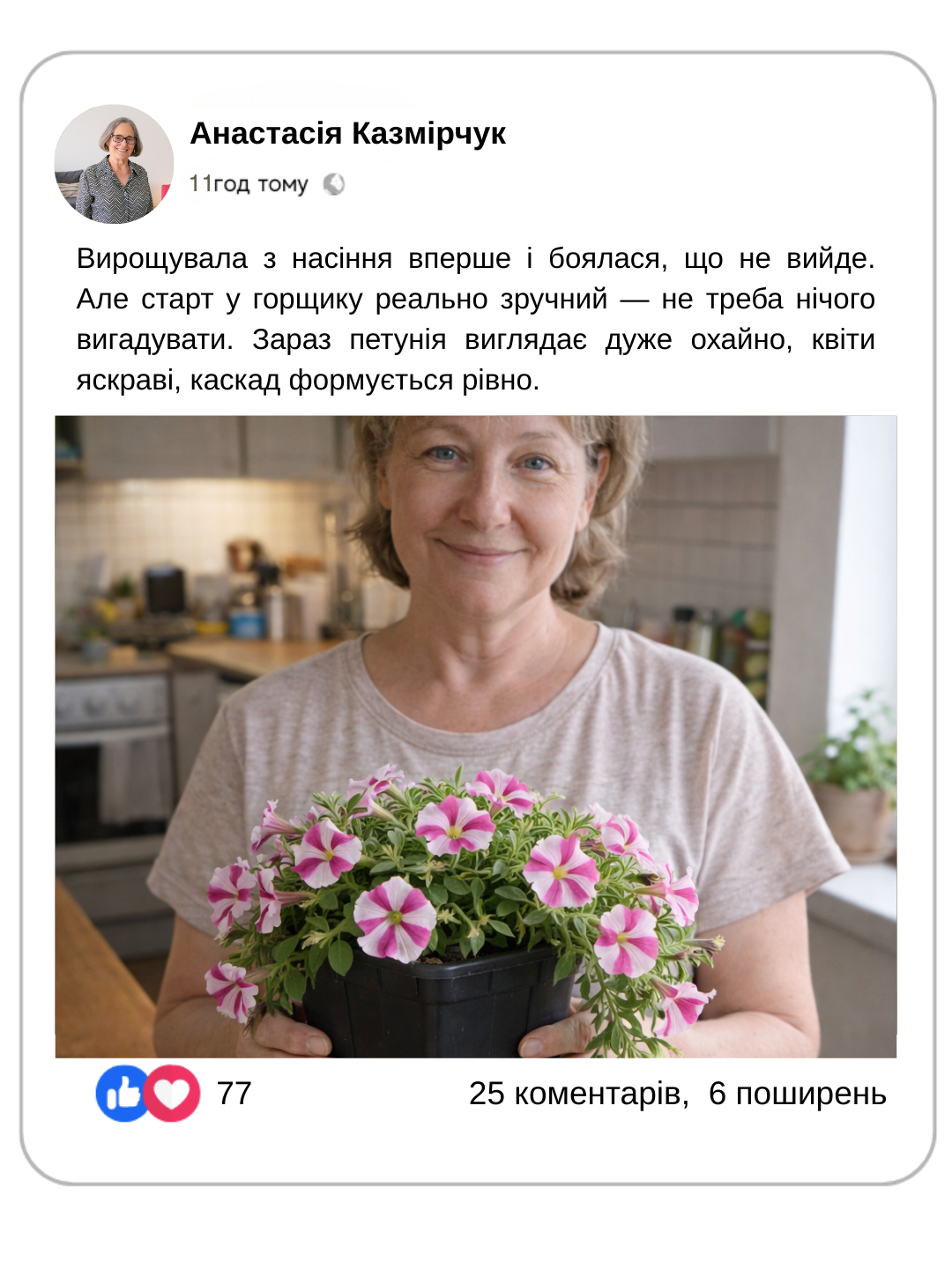 Ви бачите, як петунія росте з перших днів — і точно знаєте, що і в яких умовах її виростили.